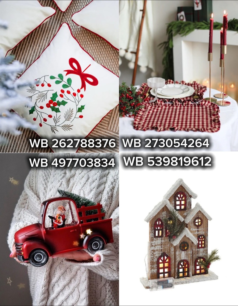 Эта подборка с вайлдберриз — готовый сценарий для новогоднего интерьера в классической гамме красного, зелёного и тёплых натуральных оттенков дерева и пледа. Разберём каждую находку по порядку, ориентируясь на артикулы с коллажей.