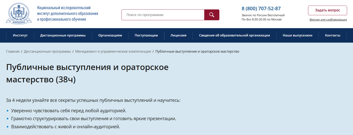 - Онлайн-обучение, направленное на развитие навыков публичных выступлений и уверенного общения.