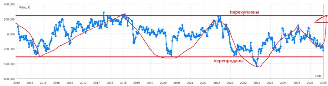 #Indicators #Sentiment #CFTC Позиционирование рынка через CFTC по некоммерческим чистым позициям по S&P 500. Еженедельный отчет Комиссии по торговле товарными фьючерсами (CFTC) по некоммерческим чистым позициям по S&P500 отражает разницу между общим объемом длинных и коротких позиций по индексу S&P500, открытых некоммерческими (спекулятивными) трейдерами. Таким образом, индикатор представляет собой чистый объем длинных позиций по индексу S&P 500 в США, которые могут косвенно указывать на ближайшие перспективы фондового рынка США. Как и в индексе Страха и Жадности (#FearAndGreed), экстремальные величины по индикатору указывают на разворот тренда. Это «длинный, долгий» индикатор. До шатдауна (сейчас данные не обновляются с 3 октября) позиционирование рынка было преимущественно в шортах. графики прилагаю к посту. Долгосрочно, после завершения текущего позиционирования в шортах ожидаю роста индикатора, что будет соответствовать росту количества лонговых позиций по S&P500 до максималь