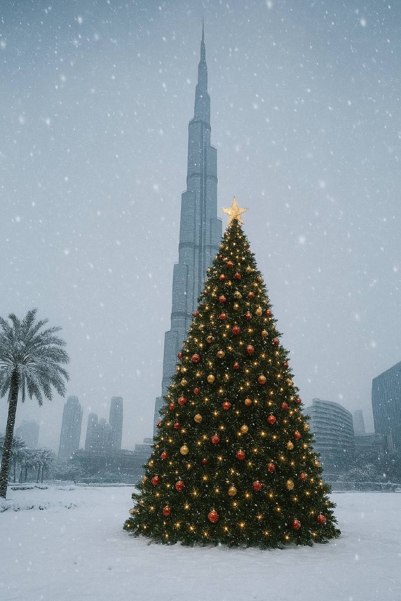 ⏺Новый год не за горами Ребята, вы замечали, как быстро летит время? Кажется, с каждым годом оно набирает скорость — только недавно все прятались от знойной жары, а уже 9 ноября! А по дубайским новостям, говорят, надвигается холодный Сибирский антициклон 😄 Не спешите откладывать отпуск — такого ☝🏼 у нас точно не будет. Но вдохновившись этой новостью, я сделал для вас серию воображаемых зимних картинок — заснеженный Дубай, ледяная Burj Khalifa и снеговики под пальмами ❄️ Конечно, в реальности такого в Эмиратах не дождемся… но согласитесь, выглядит круто! А если говорить серьезно, то в ноябре в Дубае уже чувствуется долгожданная прохлада. Средняя температура — от 24 до 26 °C. Днем — комфортные 29–32 °C, а ночью опускается до 19–21 °C. А вот чуть интересной инфы: Рекорд жары в ноябре был 40,1 °C (в Свейхане, 2024 год), а самый холодный день зафиксировали аж на Джебель Джайсе — всего 4,1 °C (в 2009 году). И вот уже совсем скоро мы будем выбирать, где встретить Новый год, какой салют
