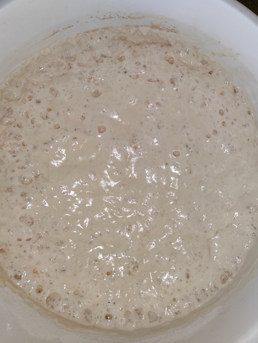Если я что-то внезапно готовлю, то...Либо я увидела "красивый" продукт, и у меня "руки зачесались". Либо что-то осталось, срок подходит к концу, а продукты я выбрасывать не люблю. Сегодня был второй вариант. Осталось у меня грамм 200 сметаны, от неё и начала"плясать". Итак, стакан молока доводим до чуть более, чем тёплое состояние. Переливаем в миску, туда же 2 чайных ложки сахара, 1 чайная ложка соли, хорошенько перемешали. Горсть муки, опять перемешали, 2 чайных ложки дрожжей, опять перемешали и в тёплое место. Я обычно ставлю к батарее или змеевику. Минут через 15-20 опара пойдёт пузырьками. Добавляем остальные ингредиенты. Сметану, два яйца, перемешиваем. Я ещё добавила семечки, знаете, продают такие наборы для салата семечки, семена, усё вместе. Муку добавляю "на глаз" т.е. получаем консистенцию уже не жидкую, но ещё "не твердую", как на фото. Убираем подходить часа на полтора. Один-два раза обминаем. Т.е. тесто поднимается, а мы его назад "отпускаем". В итоге у меня получилась
