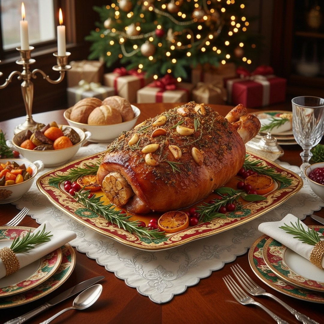 Запеченный свиной окорок с чесноком и пряными травами Ингредиенты ⤵️ 🔸 Свиной окорок – 2,5 кг 🔸 Чеснок – 1 головка 🔸 Розмарин свежий – 3 веточки 🔸 Тимьян свежий – 3 веточки 🔸 Масло оливковое – 4 ст.л. 🔸 Соевый соус – 3 ст.л. 🔸 Мед – 2 ст.л. 🔸 Соль – 1 ст.л. 🔸 Перец черный молотый – 1 ч.л. 🔸 Паприка молотая – 1 ч.л. Приготовление🍖 1. Окорок промыть, обсушить. Надрезать кожу сеткой. 2. Чеснок очистить, нарезать пластинами. Травы измельчить. 3. Сделать проколы ножом по всей поверхности, вставить в них чеснок. 4. Смешать масло, соевый соус, мед, соль, перец, паприку и травы. 5. Натрите окорок маринадом со всех сторон, оставить на 4–6 часов. 6. Разогреть духовку до 200°C. Выложить мясо в форму. 7. Запекать 20 минут, затем убавить до 160°C и готовить 1,5–2 часа. 8. Поливать выделившимся соком каждые 30 минут. 9. Дать «отдохнуть» 20–30 минут перед нарезкой. Рецепт дня #запеченный_окорок #свинина #тимьян #специи #пряные_травы #мясо #горячее #новогодний_стол