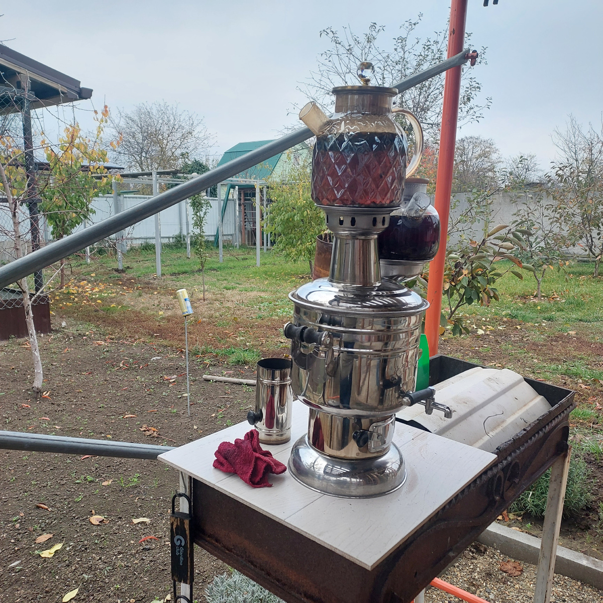 Пока чай пили я много людей хороших вспомнила. Самовар мне кумовья любимые из Новосибирска подарили. Один из чайничков и чай с брусникой друзья из Юрги привезли, когда летом к нам в гости заезжали. Они тогда много чаёв нам привезли. Запас ещё есть. Другой чайничек мне тут на Кубани подарили коллеги, когда я в школе работала. Подставочки-прихватки в виде клубничек мне сестра связала и подарила, они уюта придают. Про армуды сегодня уже говорила. От многих родных и друзей я сейчас далеко, но с большим теплом всех помню и с удовольствием бы посидела со всеми вместе за чаем. Очень мне приятно, что в нашей жизни столько хороших людей есть, которые нас любят и которых любим мы.