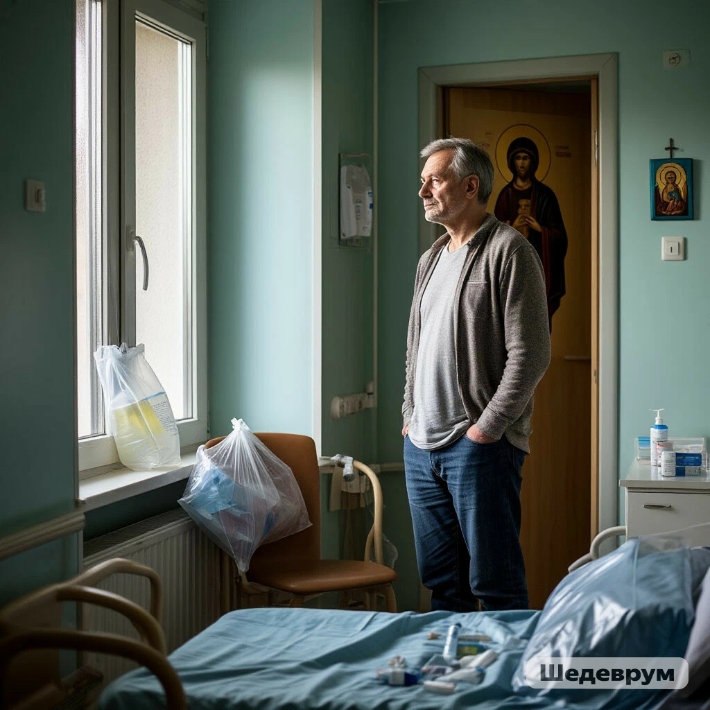 Настала пятница. После 12:00 меня на каталке перевезли из реанимации в кардиологию. Этот короткий путь через больничные коридоры стал символом начала нового этапа. На входе в отделение меня встретил лик Святого Пантелеймона — безмолвный свидетель надежд и молитв многих людей, переступающих этот порог. Первым ощущением свободы стала возможность одеться в свою одежду. Пусть это простая формальность, но она знаменует возвращение к хоть и относительной, но нормальной жизни. Палата оказалась на две кровати, укомплектованная всем необходимым: стол, стулья, холодильник, душевая, совмещённая с санузлом. Почти как скромный гостиничный номер. Неудобство, однако, вызывали дренажные трубки и приёмник — назойливые напоминания о недавнем вмешательстве. Но и здесь нашлось простое решение: медсестра аккуратно уложила конструкцию в пакет и снабдила его ручками. «Короче, так носи пока», — сказала она. И я ношу. К моей радости, слабости в ногах и головокружения не наблюдалось. Подписав согласие на обсле