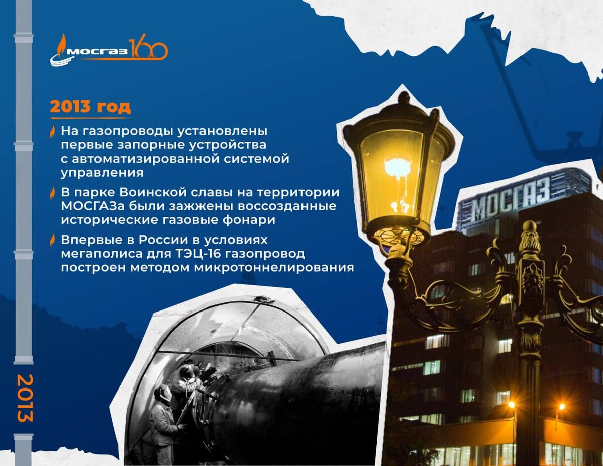 🔥Назад в 2013 🔧 На газопроводах установлены первые запорные устройства с автоматизированной системой управления — это повысит безопасность и позволит быстро перекрывать или перенаправлять подачу газа во время ремонтных и профилактических работ. 🌟 В парке Воинской славы в МОСГАЗе засияли воссозданные исторические газовые фонари! 🏙 Впервые в России в условиях мегаполиса для ТЭЦ-16 построен газопровод методом микротоннелирования — инновационный шаг в городском строительстве. #ГазовомуХозяйствуМосквы160 @aomosgaz