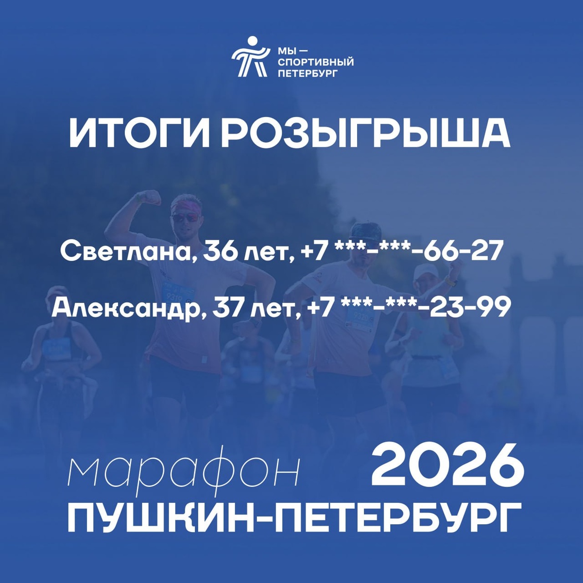 Друзья! 💥 Рады подвести итоги розыгрыша двух слотов на марафон «Пушкин-Петербург 2026»! Поздравляем победителей! 👏👏👏 ❗️ В течение следующей недели с вами свяжется представитель Комитета по физической культуре и спорту и расскажет, как забрать свой слот. 📱 Видеоотчет итогов в комментариях к посту в ВК! 🙌Будь ВСпорте!