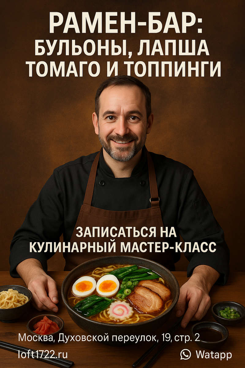 Рамен — это не просто суп. Это философия, ритуал и искусство, где каждая ложка наполнена теплом и глубиной вкуса. В Loft17 мы приглашаем вас на мастер-класс «Рамен-бар», где вы научитесь варить насыщенные бульоны, готовить лапшу, томаго и собирать идеальную миску рамэна — как в лучших барах Токио. Рамен родился в Японии, но сегодня его любят во всём мире. Каждый регион Японии имеет свой стиль: лёгкий и прозрачный сёю, плотный мисо, сливочный тонкоцу или насыщенный сёю-рамен. В Loft17 мы разбираем основы всех направлений, чтобы вы могли создавать свой собственный вкус. Правильный бульон — это медитация. Он варится несколько часов, впитывая ароматы костей, овощей и специй. На мастер-классе вы научитесь готовить три вида бульона: Мы подробно разбираем, какие ингредиенты дают вкус умами, как добиться прозрачности, и как правильно хранить бульон, чтобы он не потерял глубину. Настоящий рамэн начинается с лапши. Мы покажем, как готовить её вручную из муки, яиц и воды с добавлением кансуя — ще