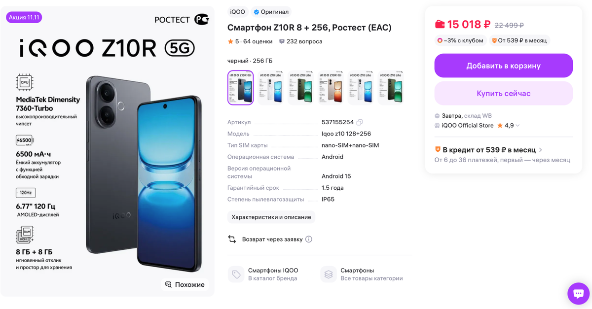 Z10R бывает в двух конфигурациях — 8/256 ГБ и 12/512 ГБ. Цены начинаются с 15-16 тысяч рублей за младшую версию и 17-19 тысяч рублей за старшую. Купить можно в официальном магазине Виво на любом известном вам маркетплейсе. У китайских продавцов Ростесты IQOO представлены минимально.
