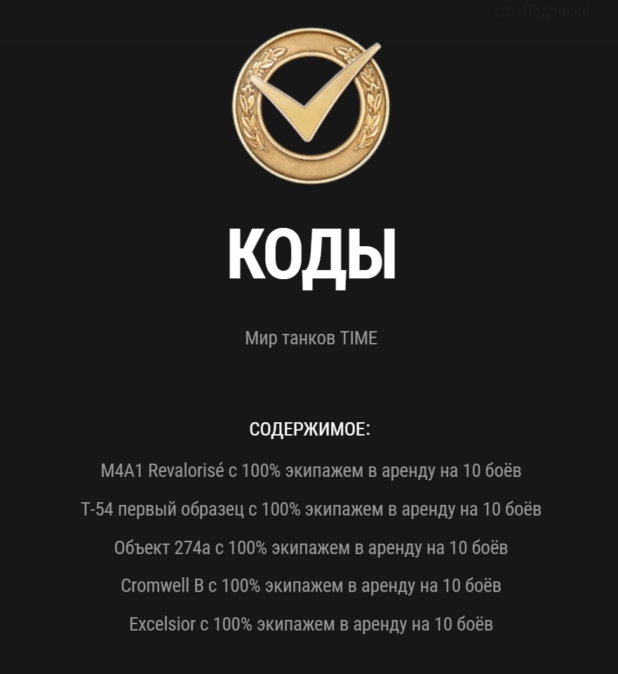 **Ловите свежую порцию бонус-кодов для "МИРА ТАНКОВ"!** Активируйте эти коды и получите возможность испытать легендарную технику в бою: * **PAY4YCVMT**: M4A1 Revalorisé с опытным экипажем (100%) – в вашем распоряжении на 10 сражений! * **25O8UFZMT**: Т-54 первый образец, укомплектованный экипажем (100%), ждет ваших побед в течение 10 боев. * **BP43P1HMT**: Объект 274а с экипажем, готовым к любым испытаниям (100%), – аренда на 10 боев. * **6EW2EJDMT**: Cromwell B с профессиональным экипажем (100%) – к вашим услугам на 10 боев! * **OCVPGTGMT**: Excelsior с полностью обученным экипажем (100%) – возьмите его в аренду на 10 боев и доминируйте на поле боя! Не упустите шанс протестировать эту мощную технику!