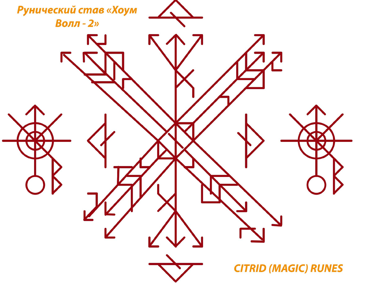 Рунический став "Хоум Волл - 2" - став на ЧИСТКУ И ЗАЩИТУ помещений (усиленный). Внешний уровень защиты под непроглядном, став имеет функцию аварийного восстановления в случае пробоев. Активация: всеми стихиями, с призывом Богов. Предостережение: на людей и живность не ставить. Руны в составе: Одал, Квеорт, Кеназ, Тейвазы, Турисазы, Урузы, Наутизы, Беркана, Альгизы,Стангин Исс и Стан.