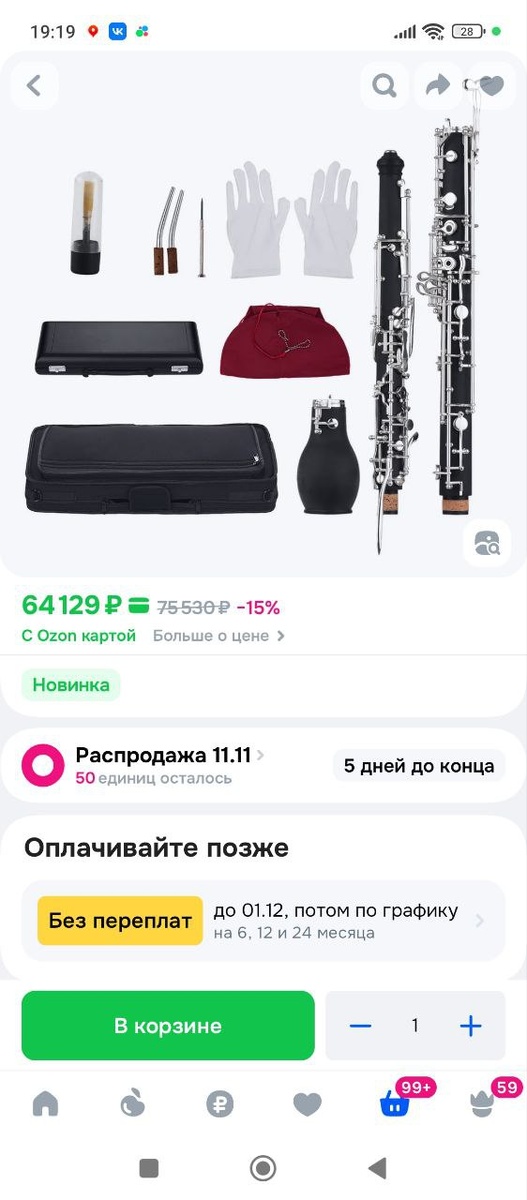 И решила я купить ещё один рожок. Если первый мне повезло купить за каких-то 35тр, то сейчас самая низкая цена 70тр (64 плюс таможенный сбор) Естесственно из Китая."Профессиональный английский рожок, F-ключ, синтетический дерево, черный и серебряный"