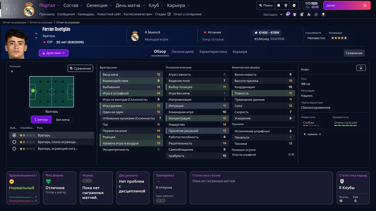 Самый перспективный вратарь нового ФМ 26 – Ферран Кетглас. Кипер молодежки «Реала» получил впечатляющие базовые способности и стабильно раскачивается до 4,5 звезд в топ-клубе. У многих перспективных вратарей динамический потенциал. Отметим, что в нидерландском АЗ сразу два таланта на воротах – Квентен Аттига и Ром-Джейден Овусу-Одуро.