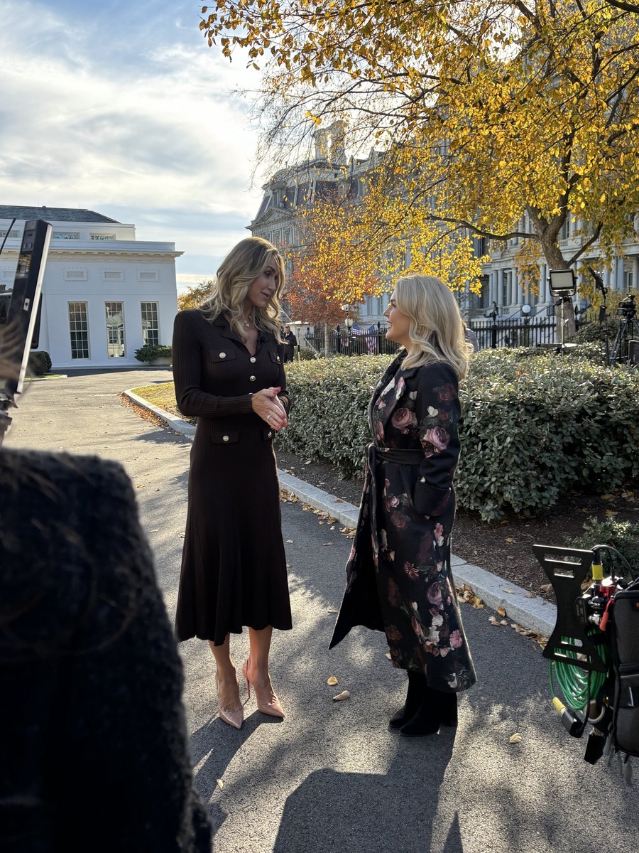 Две блондинки команды Дональда устроили сегодня перекрестное интервью в подкасте у Кэролайн. В красивом пальто с цветочным принтом, в тон к платью - пресс-секретарь президента США Кэролайен Ливитт, которая берет интервью у Лары Трамп, ведущей телешоу, жены Эрика Трампа. На 43-летней Ларе изысканно-простое платье и ... двойное колье от Van Cliff&Arpels.