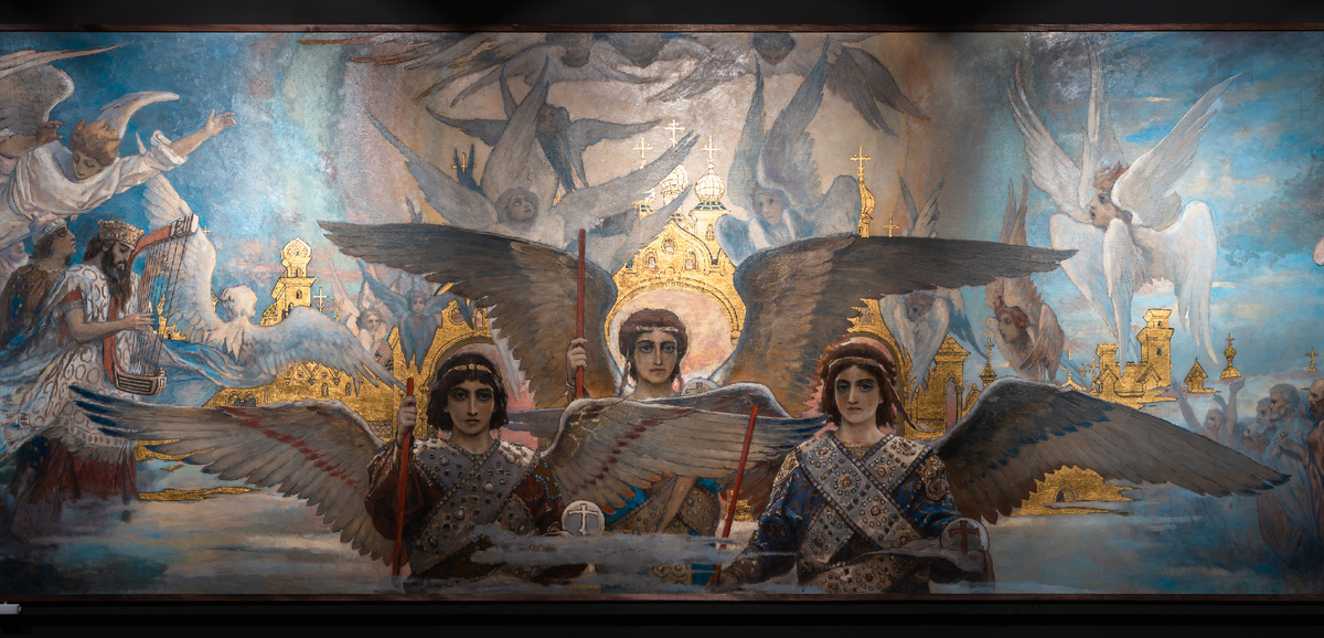 Сейчас в Нижнем Новгороде проходит выставка «Радость праведных», посвящённая как раз таким работам Васнецова. В экспозиции представлены в основном эскизы к росписям соборов в Киеве, Варшаве, Гусе-Хрустальном.