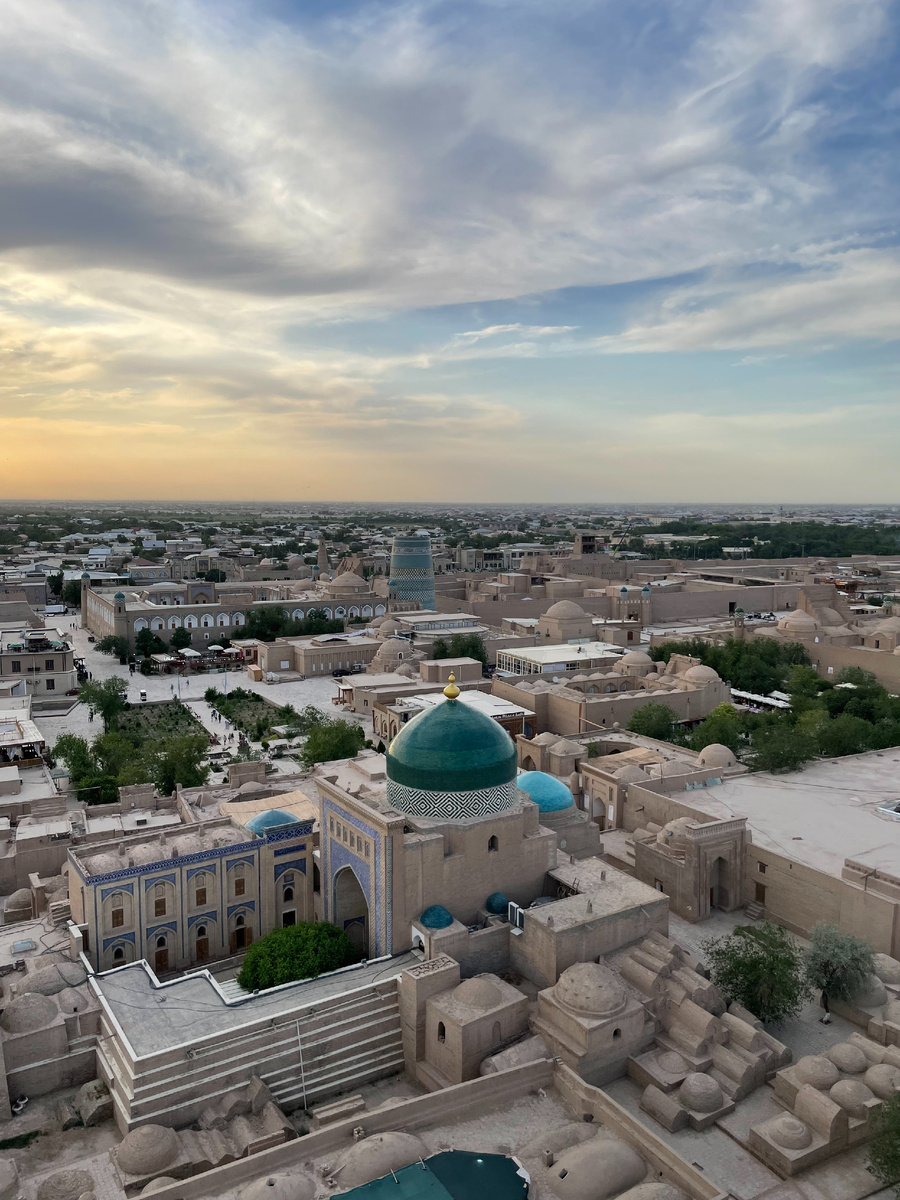 Такой я увидела Хиву. Поехала туда, чтобы посмотреть «законсервированную» последнюю столицу древнего Хорезма и её сердце - Ичан-Кале. Ичан-Кале - это шкатулка с драгоценностями. Чем-то напомнил мне Флоренцию, такая же геометричная планировка. Окружена глинобитной крепостью, внутри стены - лабиринт саманных стен и минареты в голубых майоликах, но за дверьми дворцы с узорчатыми айванами и ханскими покоями в богатом убранстве, не менее роскошные мавзолеи и жилые дома. Я особенно люблю такие места, которые не застыли музеями, а где продолжают жить свою жизнь люди, для них исторические памятники часть быта. В Самарканде было жарко, в Бухаре ещё жарче, но в Хиве я почувствовала, что пустыня совсем рядом. Зной, нега, белое солнце и вот я прячусь от жары в нескольких слоях шелковых платков в Джума-мечети Хивы. Есть в ней что-то таинственное. Известна она с 10 века, у неё нет привычного купола, кровля плоская, а поддерживают её 213 деревянных резных колон разного времени, самые ранние датир
