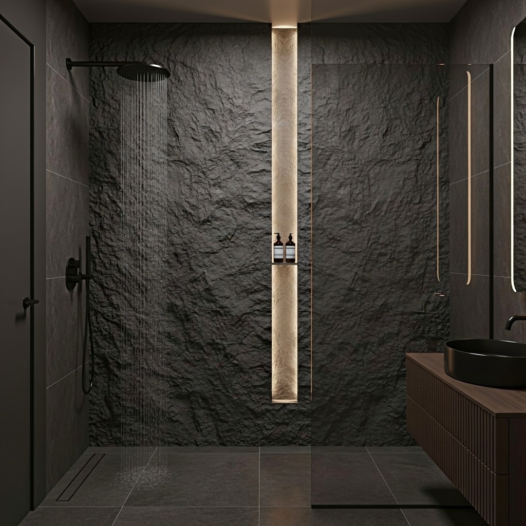 Использовать рельефную «скалу» именно в душевой сегодня решаются не только ради визуального эффекта. Это решение появилось как ответ на запрос современных интерьеров: материалы должны быть выразительными, но при этом выдерживать интенсивный контакт с водой, паром и химическими средствами. Скальная фактура в душе стала возможной благодаря развитию влагостойких декоративных составов — они позволяют создавать глубокий природный рельеф там, где раньше было допустимо только гладкое покрытие. В итоге зона душа превращается в пространство с ярко выраженной атмосферой — от SPA-камерности до эффектного «рудника» в тёплом архитектурном исполнении. Что такое скала в душевой — точное определение Интерьерная скала — это не натуральный камень, а декоративная поверхность, полностью контролируемая мастером. Она создаётся из влагостойких материалов: Важная особенность: несмотря на брутальный вид, рельеф остаётся достаточно лёгким и не создаёт нагрузку на стены, что позволяет использовать его даже в неб