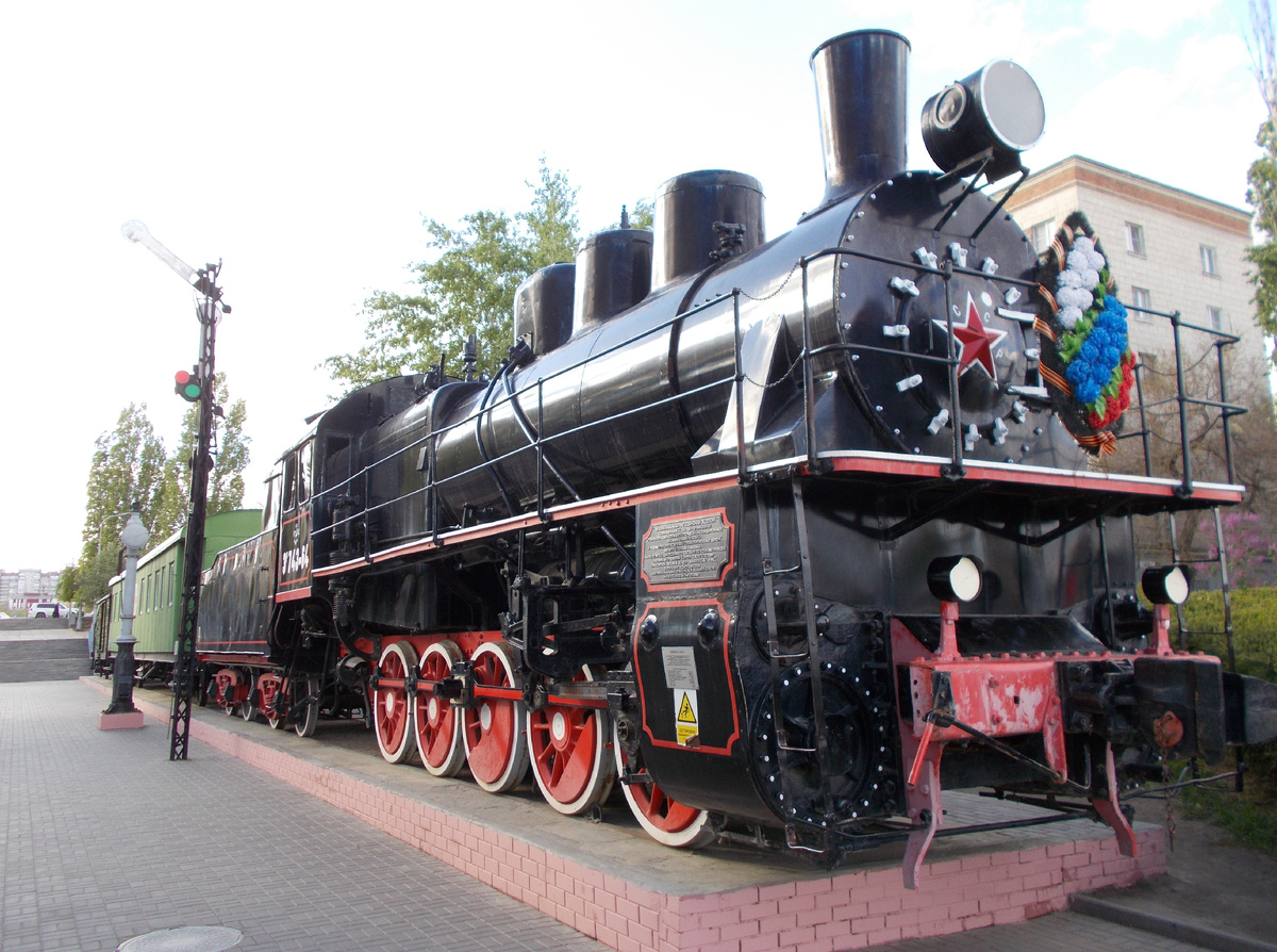 Всем здравствуйте! Давно собиралась написать об этом памятнике; как раз восстановила фото, сделанные в апреле 2023 года. Памятник "Воинский эшелон" установлен возле музея-панорамы "Сталинградская битва" в Волгограде. Данный мемориальный комплекс был открыт в июне 2009-го года. Памятник посвящён железнодорожникам и военным строителям, обеспечившим бесперебойное снабжение Сталинградского фронта военными грузами в период Сталинградской битвы. Мемориальный комплекс был сооружён по инициативе председателя совета ветеранов Волгоградских железнодорожников. Во главе поезда находится паровоз Эр 743/64. На тот момент в составе было также три вагона. Работы по реставрации подвижного состава и его установке проведены работниками предприятий Волгоградского отделения Приволжской железной дороги. Состав установлен на постаменте с рельсами. Перед составом установлен семафор. Паровоз Эр был найден в 2008-м году на заводе "Красный Октябрь". Изначально в состав входили четыре вагона (вместо санитарного