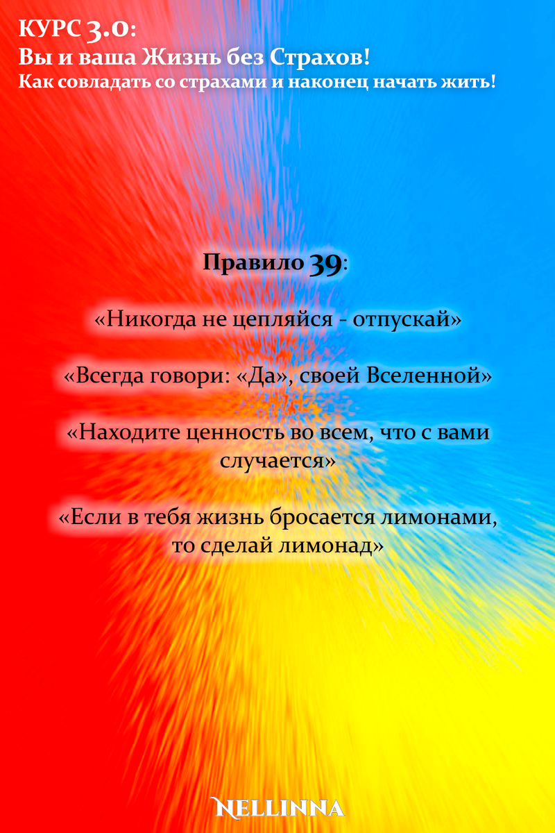 Продолжение - Принцип 39: Слово «Да» - не только противоядие от различных проблем, но и волшебное средство для работы с вашими страхами - внутренними и глубочайшими. Ваша способность полноценно взаимодействовать с окружающим миром зависит от вашей собственной способности сказать: «Да» своей внутренней Вселенной. Вы не можете избежать проблем, но можете сказать: «Да», тогда вы не будете чувствовать себя жертвой, т.к. знаете, что способны совладать с проблемами и не воспринимать ситуацию безнадежной. Чтобы не пропустить следующую публикацию – Подписывайтесь! И делитесь полезной и бесплатной информацией! #курс #тренинг #обучение #практикум
