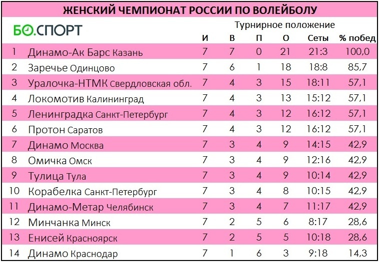 Сегодня тремя матчами завершился 7-й тур открытого женского чемпионата России по волейболу. «Заречье» в драматичной борьбе обыграло «Локомотив» – 3:1 (29:27, 29:27, 27:29, 32:30). Центральная подмосковной команды Юлия Бровкина набрала 23 очка при показателе полезности +21. Она реализовала 13 из 24 атак (54%) и поставила 9 из 20 командных блоков. В составе «Локо» 44 очка (11 брейковых) наколотила бразильская диагональная Киси Насименто. Она забила 41 из 75 мячей (55%), поставила три блока и заработала показатель полезности +29. В атаке у неё восемь ошибок и семь попаданий под блок. Впервые в этом сезоне за «Локомотив» сыграла Ирина Воронкова. Доигровщица помогла команде отца перед отъездом в чемпионат Китая. У неё 14 очков (+4), 28% в атаке (13/47, семь потерь) и 37% в приёме (две ошибки). В регулярном чемпионате 14 команд сыграют в два круга – дома и в гостях с каждым соперником. Восемь лучших команд выйдут в четвертьфинал. Нажав на счёт, можно увидеть развёрнутую статистику матча. Чем