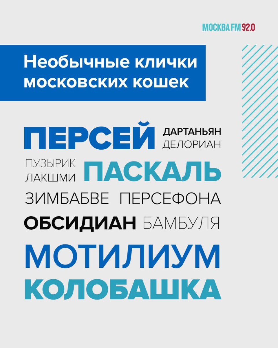 😊 Столичные ветеринары назвали редкие клички своих пушистых пациентов Есть кошки-москвички с именами литературных и мифических персонажей, а также мурки с забавными кличками. Собаки, кстати, тоже не отстают: в числе самых необычных — Баунти, Биткоин, Майбах, Забава Путятична, Зевс, Сумрак, Танго и Тиграна. 😮 А как зовут вашего любимца? Делитесь в комментариях ⬇️ 📌 Подписаться на Москва FM / Наш чат-бот / Мы в MAX