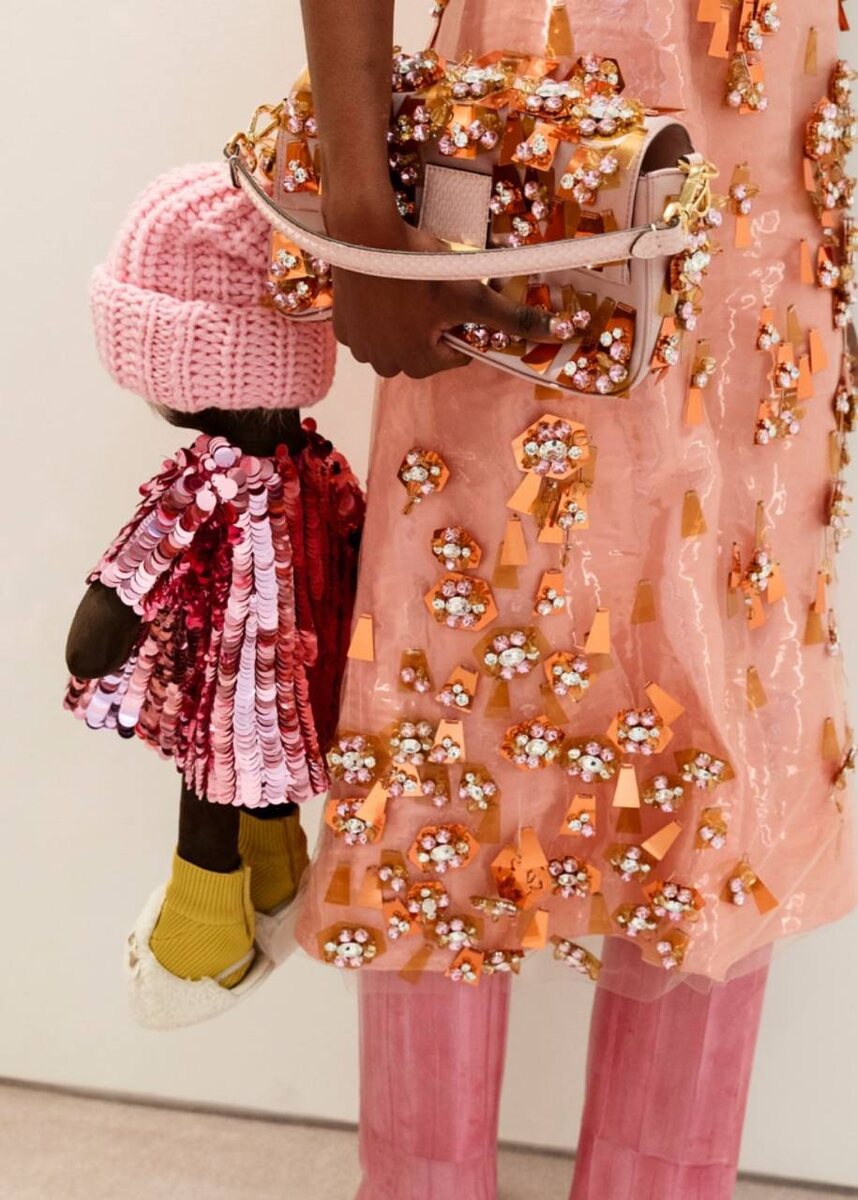 Fendi уже не знают как отличиться, и в новой коллекции к сумкам предлагают не брелок, а гигантскую куклу, расшитую пайетками и одетую с головы до ног в Fendi. Аксессуар получился настолько крупным, что его проще посадить рядом, чем повесить на сумку. Мода на максимализм вышла на новый уровень. Кстати, в Китае прям сильно больше любителей обвесов на сумки - какой нибудь зверек висит у каждой женщины и половины мужчин 🇨🇳