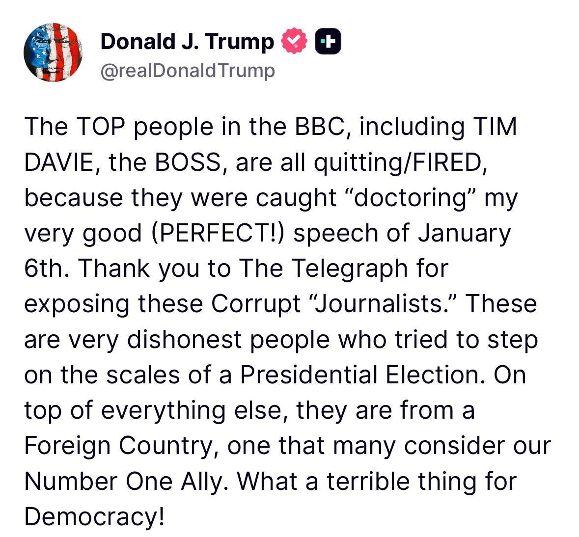 ⚡️ Trump THANKS Telegraph for story triggering RESIGNATION of top BBC executives ‘Very DISHONEST people… from a foreign country that many consider our number one ALLY’ ‘TERRIBLE thing for Democracy’