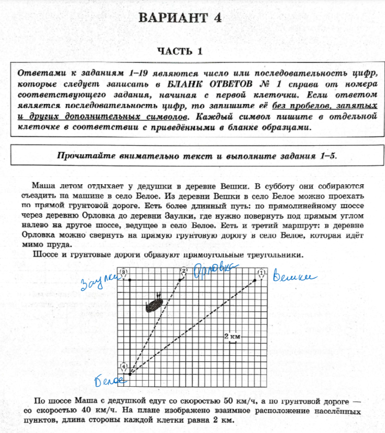 Подписывайся на мой ТГ канал 🤗 Ответ: 324 №2. Найдите расстояние от деревни Орловка до села Белое по прямой. Ответ дайте в километрах. В этом задании по теореме Пифагора находим гипотенузу. Не забыть: перевести клетки в километры! Ответ: 34. №3. Сколько минут затратят Маша с дедушкой на дорогу из деревни Вешки в село Белое, если поедут по шоссе до деревни Орловка, а потом свернут на прямую грунтовую дорогу, которая идёт мимо пруда? Чтобы найти время, нам нужно расстояние делить на скорость. При этом нужно учесть, что расстояние по шоссе мы делим на скорость по шоссе, а расстояние по грунтовой дороге делим на скорость по грунтовой дороге. Скорости по шоссе и грунтовой дороге даны в тексте задания. В задаче спросили сколько минут, а, поделив расстояние на скорость, мы нашли часы, поэтому сразу же домножаем на 60 - так мы перевели часы в минуты и дали себе возможность сократить дроби! Ответ: 79,8 №4. На сколько процентов расстояние от деревни Вешки до села Белое через деревню Заулки