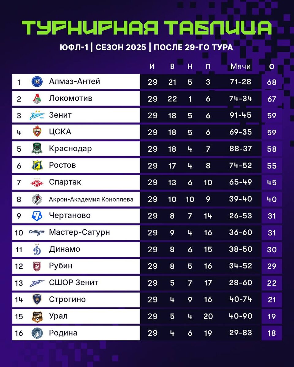 «Динамо» вырвалось в лидеры ЮФЛ-2 за тур до конца 🔥 Всё из-за осечек «Краснодара» и «Зенита». Развязка – просто космос! 🚀 В ЮФЛ-1 «Алмаз» и «Локо» тоже решат судьбу чемпионства в последнем туре 🔜 А в ЮФЛ-3 «Зенит» до сих пор не выиграл золото только по дополнительным показателям – следующая неделя может определить победителя 🏆 Давно такого жаркого конца сезона не наблюдали. Пацаны, мы кайфуем 🥰
