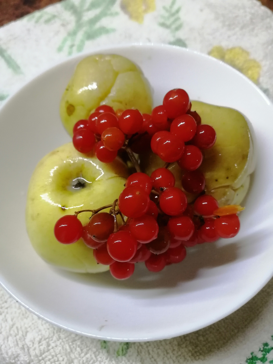 На дно уложила листья. Брусники не было, то взяла калину гроздьями. Она даёт и цвет яблочкам, и какой то вкус оригинальный.