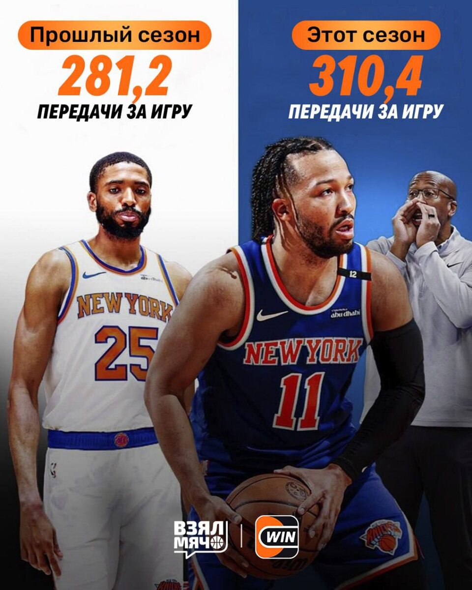 🪄 Магия Майка Брауна в действии В прошлом сезоне «Нью-Йорк» делал в среднем 281,2 передачи за игру — это был лишь 18-й показатель в лиге. В этом году уже 310,4 передачи — пятое место в НБА. Мяч стал больше двигаться и каждый игрок может получить шанс сделать свой вклад в успех команды. Как вам игра «Никс» в этом сезоне? 🤔 🏀 ПОДПИШИСЬ — ЗДЕСЬ ЖИВЁТ БАСКЕТБОЛ!