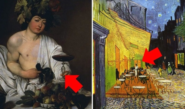 На первый взгляд, сюжет кажется простым, однако восемь лет назад группа экспертов, применив метод рефлектографии, обнаружила любопытную деталь в кувшине с вином (в нижнем левом углу): в этом месте Караваджо оставил миниатюрный автопортрет.