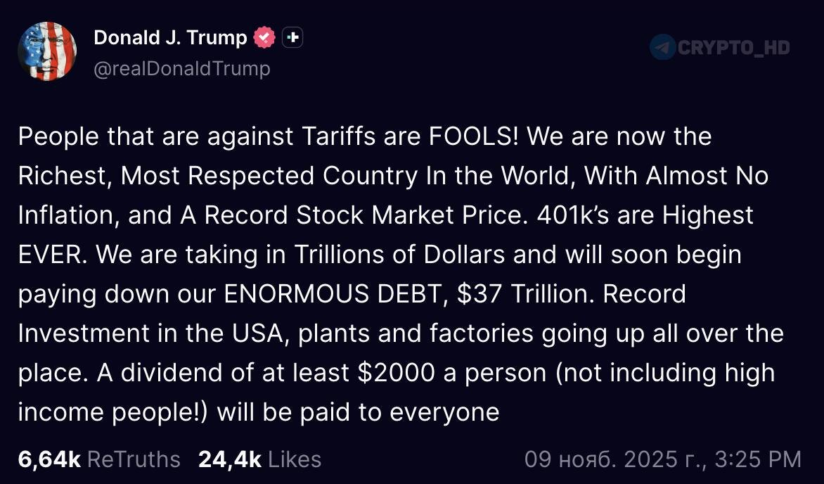 🇺🇸 Дональд Трамп вчера снова пообещал выплатить по $2000 американцам! - пост «Люди, которые выступают против тарифов, — ДУРАКИ! Мы сейчас самая богатая, самая уважаемая страна в мире, с почти нулевой инфляцией и рекордными показателями фондового рынка. 401(k) — на самом высоком уровне за всю историю. Мы получаем триллионы долларов и вскоре начнём погашать наш ОГРОМНЫЙ ДОЛГ — 37 триллионов долларов. Рекордные инвестиции в США, повсюду строятся заводы и фабрики. Дивиденд не менее $2000 на человека (за исключением людей с высоким доходом!) будет выплачен всем» 👣 Министр финансов США: «Этот «дивиденд» может проявиться не в виде прямых чеков, а через налоговые льготы — например, отмену налогов на чаевые, сверхурочные, социальное обеспечение и другие меры из повестки Трампа» Среди сторонников Трампа идея вызывает энтузиазм — люди обсуждают, как инвестировать эти деньги в акции, крипту или мемы, видя в этом стимул для рынка. Ранее: мнение Crypto Headlines