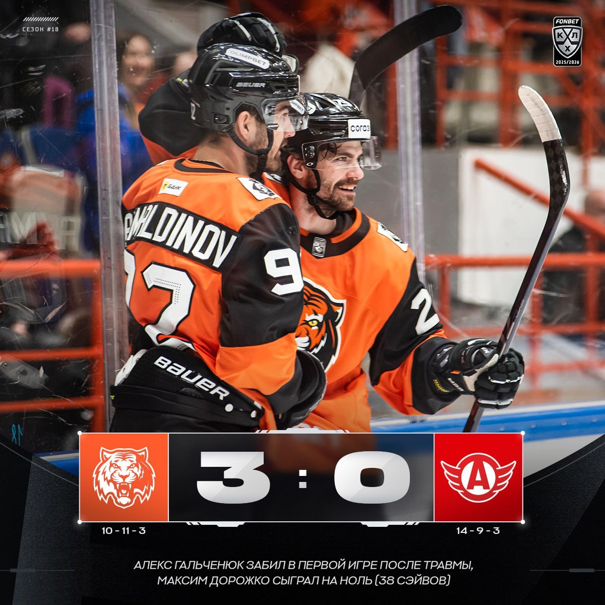 ХОККЕЙ | «АМУР» ДОБЫЛ «СУХУЮ» ПОБЕДУ НАД «АВТОМОБИЛИСТОМ» В ХАБАРОВСКЕ 9 ноября, на стадионе «Платинум-Арена» в Хабаровске состоялся матч регулярного чемпионата Континентальной хоккейной лиги между «Амуром» и «Автомобилистом». «Тигры» оказались сильнее – 3:0. На 23-й минуте счёт открыл Алекс Гальченюк. В середине периода отличился Рауль Акмальдинов. На 58-й минуте своё имя в протокол вписал Илья Талалуев. Для «Автомобилиста» это уже третье поражение подряд. Команда с 31 очком занимает четвёртое место в турнирной таблице Восточной конференции. «Амур» набрал 23 балла и поднялся на седьмую строчку. ФОТО: Официальный ТГ-канал министерства спорта Хабаровского края #аврорамедиа_хоккей 🌟 Информационная-экосистема АВРОРА⭕️МЕДИА МЕДИА | НОВОСТИ | РЕГИОН | ЛАЙФ | СПОРТ | ГЕРЛЗ | ХАЙТЕК | ПЕРСОНЫ | ИНСАЙД | КРИМИНАЛ | МОЛОДОСТЬ | LIVE АВРОРА⭕️МЕДИА YOUTUBE | RUTUBE