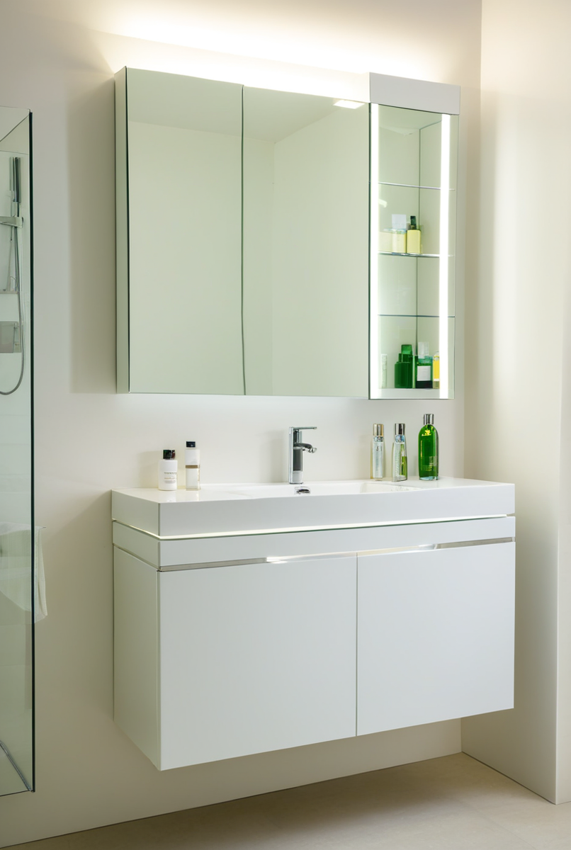 Технологичная мебель для ванной: встроенный шкаф с подсветкой (светодиодная подсветка)‚ с розеткой‚ с подогревом (антизапотеватель) и сенсорным выключателем