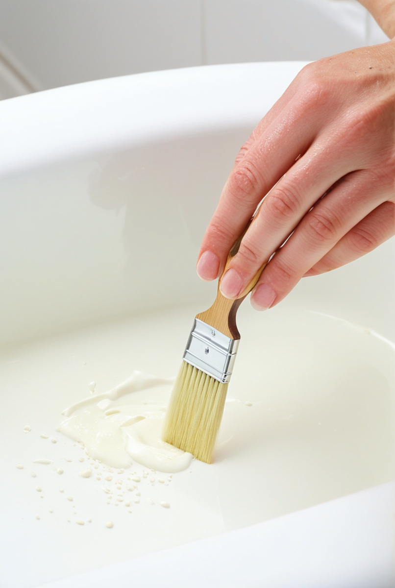 - Нанесение эмали: Встряхните флакон. Чтобы заделать трещину или скол‚ наносите средство аккуратно тонким слоем с помощью кисточки. Если дефект глубокий‚ может потребоваться несколько слоев. Дайте каждому слою немного подсохнуть перед нанесением следующего.