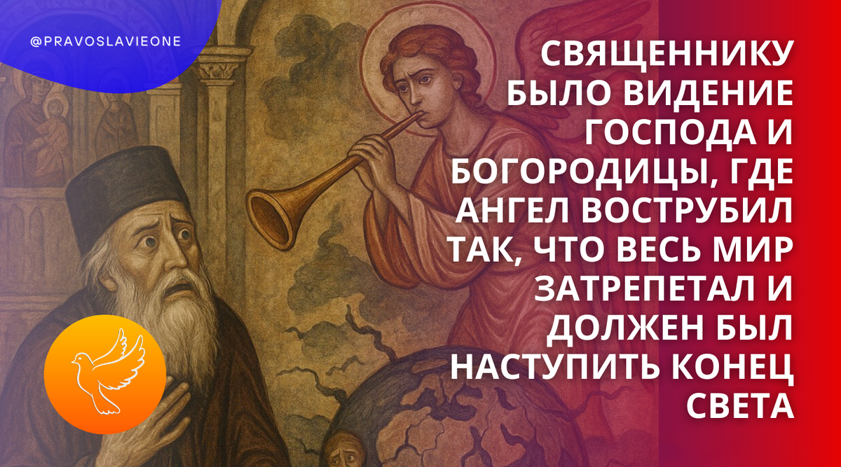 Как гласит предание, этот священник в духовном прозрении увидел Господа нашего Иисуса Христа, восседающего на величественном Престоле. Справа от Него стояла Небесная Владычица. По велению всего небесного воинства могучий Ангел, державший огромную трубу, вострубил. Звук был настолько громогласным, что весь мир затрепетал, словно лист на дереве под порывом ветра.