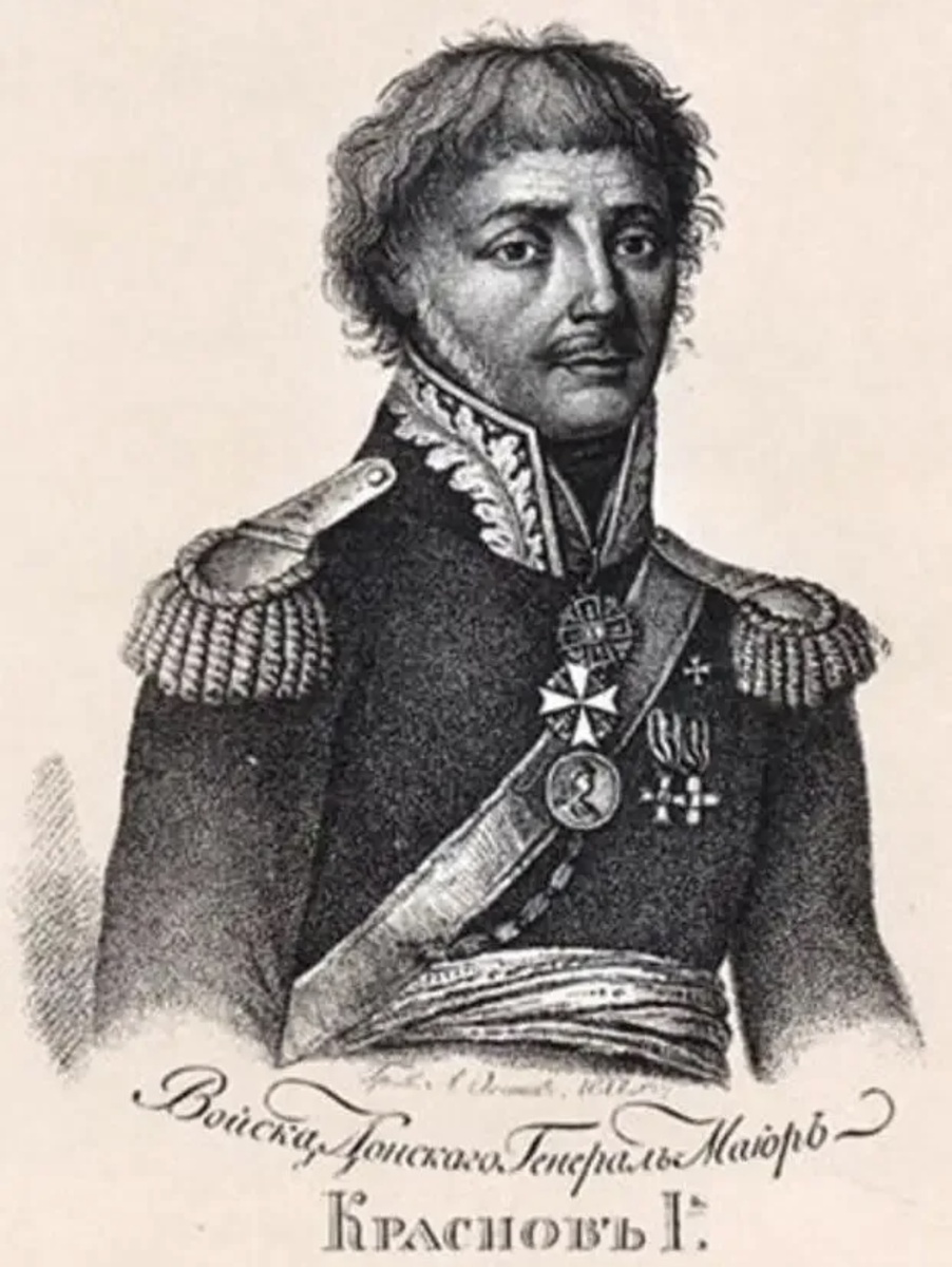 История России знает тысячи славных имен, но, к сожалению, многие из них со временем были преданы забвению. Одно из таких имён — генерал-майор Иван Козьмич Краснов, человек, судьба которого тесно переплелась с самыми яркими страницами военной славы XVIII–XIX веков. Он родился в 1752 году (по другим данным — в 1753-м) в станице Букановской Области Войска Донского. С юных лет впитал в себя дух донского казачества — отвагу, верность долгу и непоколебимую готовность стоять за Отечество до последнего вздоха. Свою службу начал в 1773 году простым рядовым казаком в полку Коршина. Благодаря уму, грамотности и трудолюбию вскоре стал полковым писарем. Но впереди его ждала жизнь, полная сражений, подвигов и испытаний. Он прошёл Русско-турецкую войну 1768–1774 годов, отличился храбростью и был произведён в сотники, а затем в поручики. Особую славу Ивану Козьмичу принес Кинбурнский бой 1 (12) октября 1787 года, когда он, будучи ординарцем у самого Александра Суворова, получил приказ передать ба