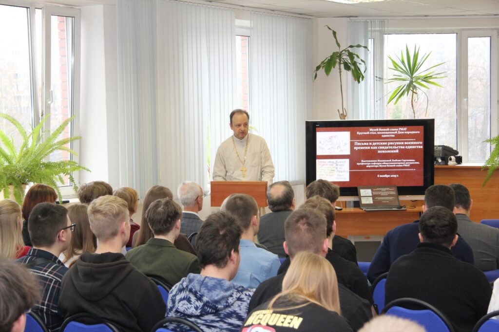 7 ноября 2025 года в Российской международной академии туризма в Химках в рамках регионального этапа XXXIII Международных Рождественских образовательных чтений состоялось заседание круглого стола на тему: «Единство России – это героизм и сплочённость многонационального народа». Мероприятие, организованное совместно РМАТ и Сергиево-Посадской епархией, провёл председатель Епархиального отдела по работе с вузами и научным сообществом, клирик Троицкого храма г. Химки иерей Глеб Курский. Заседание открыла проректор-декан факультета менеджмента туризма Е. А. Алилуйко, подчеркнув важность просвещения в деле формирования личности студентов. С докладами выступили преподаватели Академии туризма Л. С. Именнова, О. Н. Долженко, И. А. Жарков, а также приглашённые гости. Иерей Глеб Курский представил вниманию собравшихся сообщение на тему «Героизм и формирование личности: опыт внутренней организации мировоззрения». Участники круглого стола положительно оценили результаты его работы, приняли решение