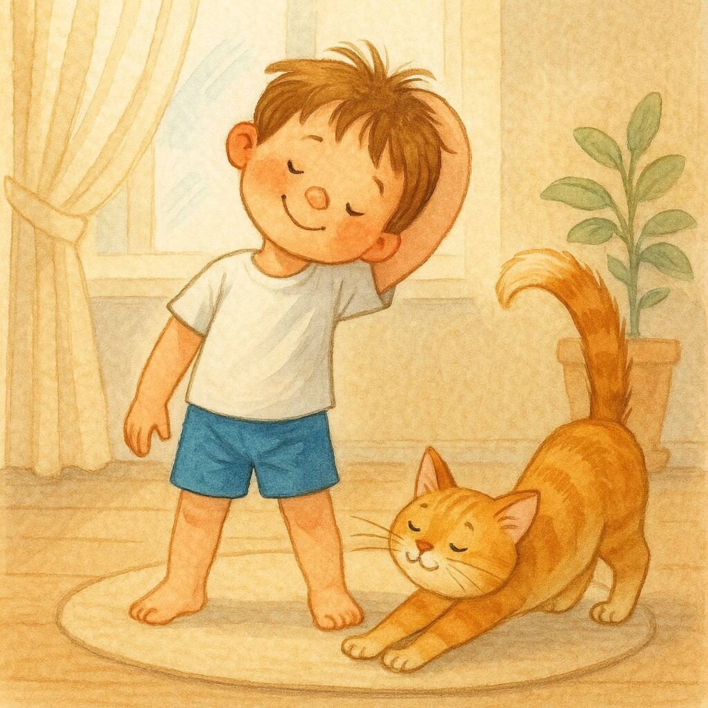 История # 21 В одном солнечном городке жил-был мальчик по имени Гоша. У него был пушистый котик по имени Палёнка, который всегда был рядом с ним. Однажды, проснувшись рано утром, Гоша потянулся, зевнул и посмотрел на окно. Солнечные лучи ярко светили, и на улице пела птица. — Палёнка, — сказал Гоша, — сегодня такой прекрасный день! Давай с сегодняшнего дня начнем делать зарядку, чтобы быть здоровыми, сильными и веселыми всегда! Палёнка, усевшись на подоконник, потянулся и ответил: — Звучит здорово! Гоша вскочил с кровати и начал делать простые упражнения. Он поднял руки вверх, наклонился в стороны, а потом начал приседать. Палёнка с интересом наблюдал за его движениями и стал повторить некоторые из них: он выгнул спину и потянулся к полу. — Ты тоже занимаешься зарядкой, Палёнка! — смеялся Гоша. — Давай! Котик посмотрел на Гошу и стал повторять все упражнения за Гошей. — У тебя получается! — радовался Гоша. — Теперь давай сделаем несколько прыжков! Они вдвоём начали прыгать