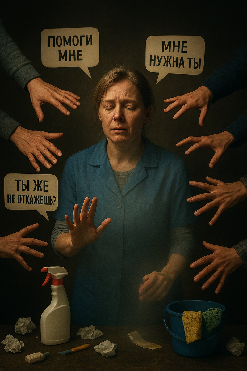 Вот вам Елена, пятидесятидвухлетняя уборщица в офисном центре. Пришла с жалобами на постоянную усталость и «приступы злости на ровном месте». Копаясь в её жизни, я увидел классический синдром «хорошего человека» 🧹. Коллеги постоянно просили её подменить, взять дополнительные объекты — она соглашалась. Дочь-студентка звонила среди ночи с проблемами — Елена бросала всё и ехала. Подруги жаловались на жизнь часами — она слушала, забывая про свои дела. Собственного времени не оставалось. Спала по пять часов. Хронические боли в спине, мигрени, давление скачет. А на вопрос «почему не откажешь?» отвечала: «Как я могу? Они же нуждаются в помощи. Я не хочу быть эгоисткой». Мы потратили несколько сессий на разбор: где заканчивается доброта и начинается жертвенность? Доброта — это когда вы помогаете, имея ресурс, из искреннего желания. Жертвенность — когда помогаете через «не могу», в ущерб себе, из страха отказать 💔. Елена помогала не от щедрости, а от ужаса оказаться «плохой». И платила за это здоровьем и жизнью.