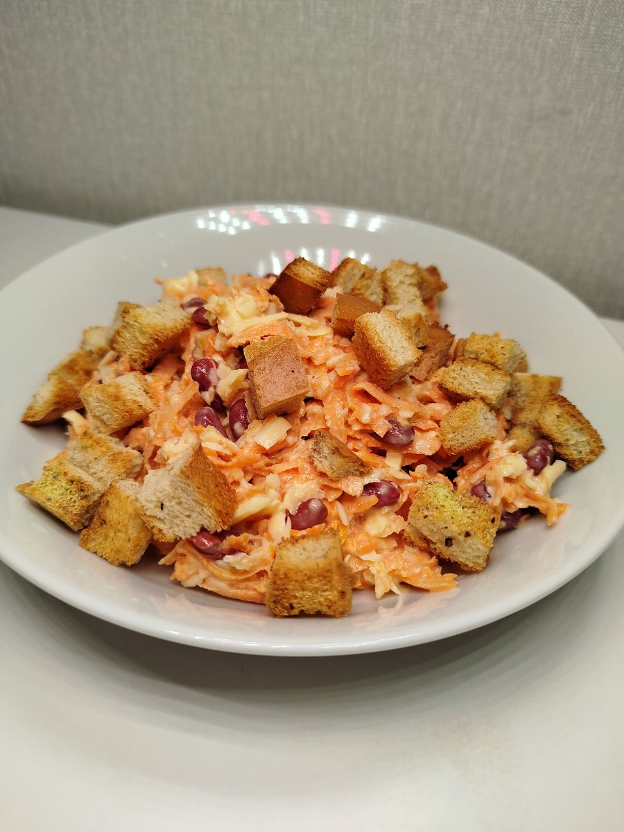 Салат из красной фасоли, тёртого чеснока, домашних сухариков со специями, тёртого сыра, майонеза и морковки.