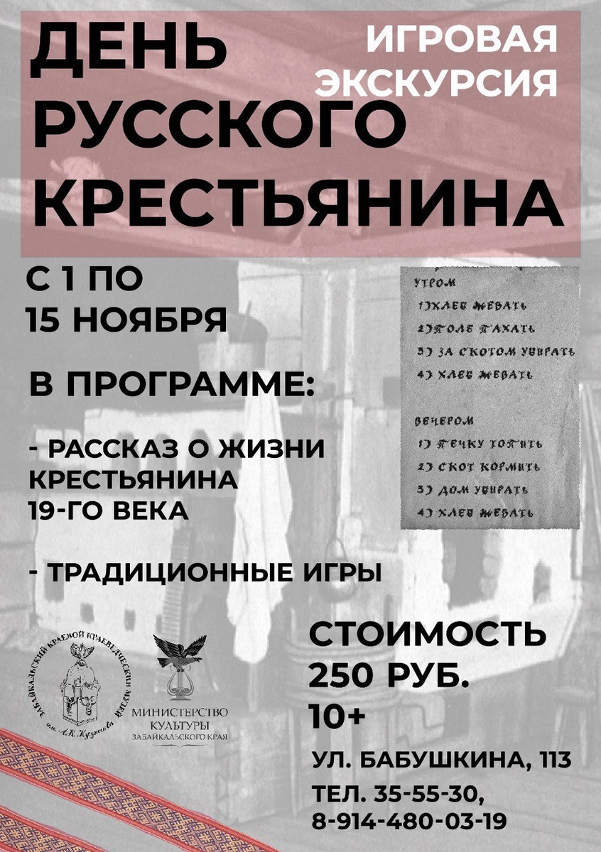 Каким был обычный день русского крестьянина? Как рано вставал ? С чего начинал свой день? Сколько часов работал? Что ел? Хотите узнать ответы на эти вопросы? Приходите на игровую экскурсию "День русского крестьянина" в Забайкальский краевой краеведческий музей. Она будет проходить до 15 ноября. На ней вы сможете узнать больше о быте русского крестьянства, посмотреть музейные экспонаты и поиграть в веселые игры. 🔑 подробности по телефонам: +79144800319, +73022355530 🪙 250 рублей #Афиша Предложить публикацию:@zabkulisye_bot