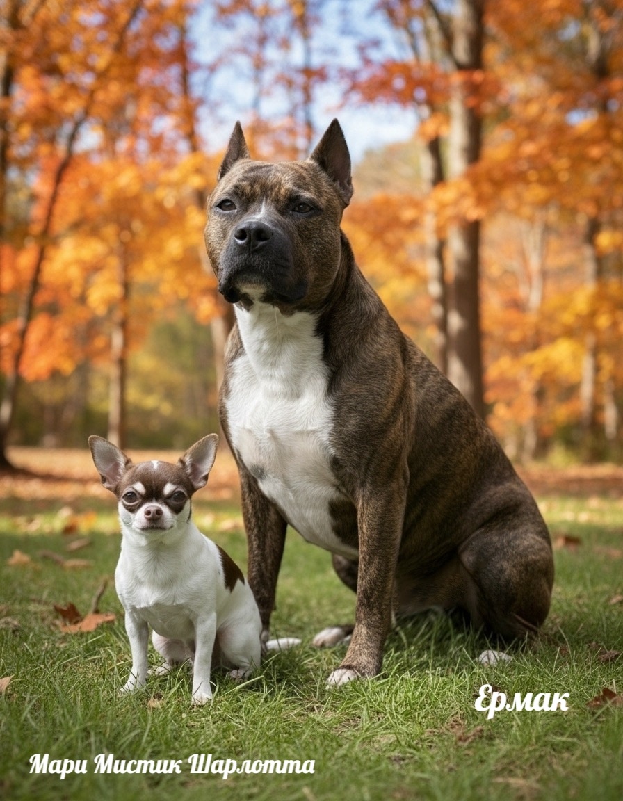 на фото ниже наша чихуахуа Ника вес 1,5 кг и ам. стафф. Стася (Антари заводчик Лариса Румянцева).