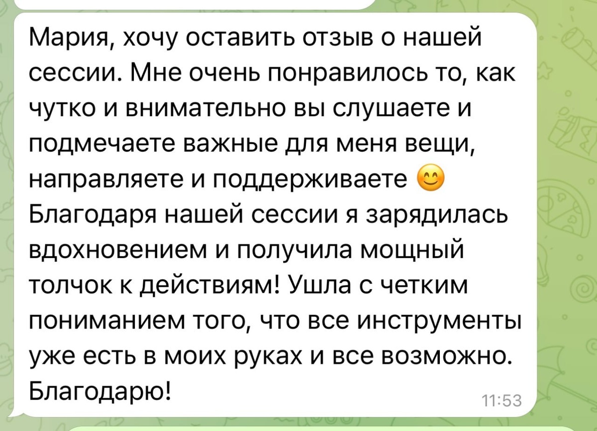 Когда есть цели, но нет сил: выход есть! Бывает ведь такое? Вроде бы и цели есть, и планы, но ничего не делаешь. Ничего не хочется, все валится из рук. - Сидишь и думаешь: «С чего бы начать? А, вообще, стоит ли?!» — а в ответ тишина. - Сомнение гложет: «А справлюсь ли я вообще?» - Понимаешь, что нужно двигаться, но нет сил и глаза не горят. В таком состоянии обратилась ко мне Надежда. Я не давала готовых советов и ответов, вместо этого помогала ей самой увидеть то, что было прямо перед носом. Мы обратили внимание на её сильные стороны и настоящие ценности, которые она раньше не замечала. Вот что сказала Надежда после сессии: «Не знаю, как это работает, но прямо захотелось действовать! Появилась энергия. Теперь я точно знаю, с чего начать и куда двигаться. Оказалось, всё для успеха у меня уже есть!» Хочешь так же? Если тоже чувствуешь, что застрял(а) и не можешь сдвинуться с места — напиши мне «хочу действовать». Всего за одну беседу ты: • Найдёшь силы и мотивацию • Поймёшь