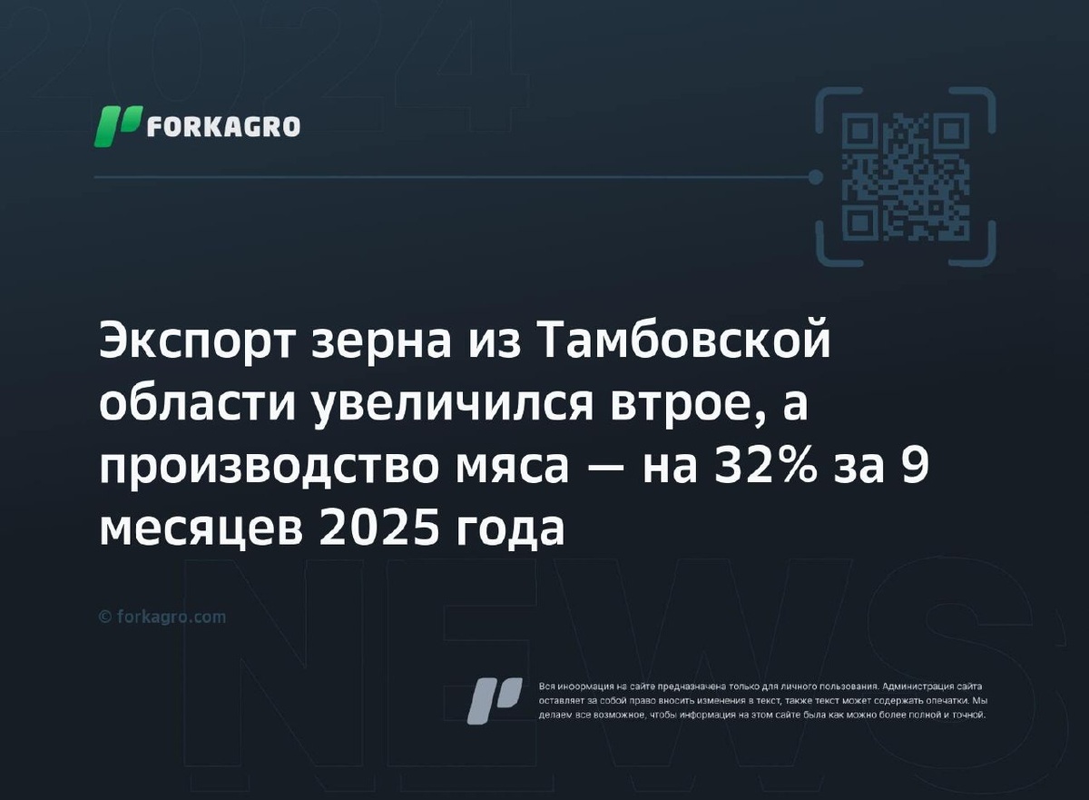Экспорт зерна из Тамбовской области увеличился втрое, а производство мяса — на 32% за 9 месяцев 2025 года За первые 9 месяцев 2025 года аграрный сектор Тамбовской области продемонстрировал рост экспорта зерна в 3 раза, сахара — на 25%, мясной продукции — на 32%. Регион входит в топ-30 по объему экспорта агропродукции, поставляя свою продукцию в 36 стран мира. Урожайность зерновых и сахарной свеклы значительно возросла. Тамбовская область уверенно удерживает лидирующие позиции в производстве агрокультур и мяса в регионе и стране. Сельское хозяйство составляет более 20% валового продукта области, превышая средний уровень по России. Перейти к источнику