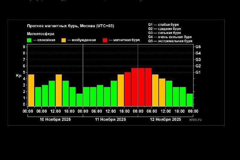 Любители свалить все на магнитную бурю, ликуйте! 11-12 ноября из-за новой вспышки на Солнце нас ждет магнитная буря второго уровня из пяти. Судя по графику, пик шторма придется на 00:00—06:00 (мск). Вероятность события 11 ноября составляет 90%, 12 ноября она уменьшается на 5%. Изображение с сайта лаборатории солнечной астрономии ИКИ и ИСЗФ 🔷🔹Подпишись на новости Иркутска