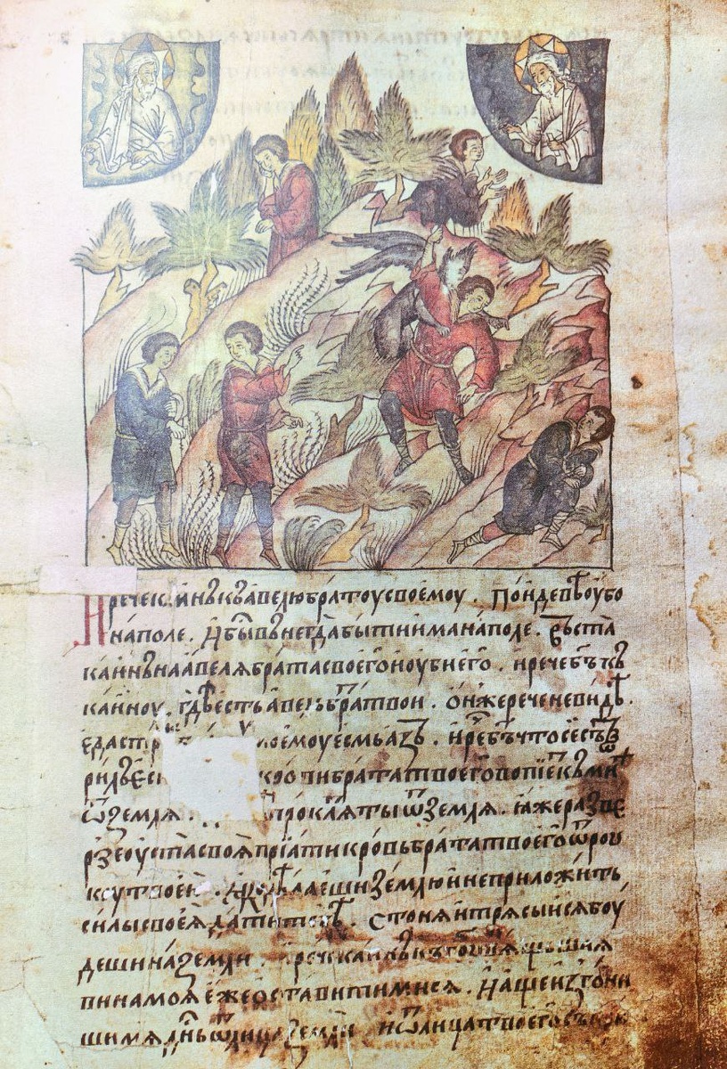 Первое убийство человка человеком. Страшный момент. Только представьте: было время, что никто никого не убивал. Библейская история. Лицевой летописный свод. Книга Бытия. Миниатюра и текст. Читаем первые два предложения (в скобках даю пояснение): "И рече Каин Авелю брату своему: пойде ве (пойдем мы вместе) убо на поле. И было, внегда быти им на поле (когда они были на поле) воста (востал) Каин на Авеля брата своего и уби (убил) его"