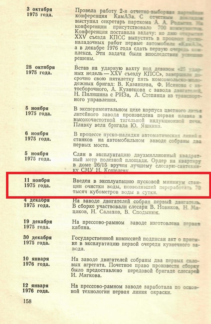 11 ноября 1975 года в Набережных Челнах была введена в эксплуатацию I очередь станции очистки воды (1 смеситель, 2 отстойника, 6 фильтров, 2 резервуара, насосная станция второго уровня подъёма, хлораторная, реагентное хозяйство и т.д.) Эта дата приведена в книге «Становление», написанной Родыгиным Аркадием Аркадьевичем – секретарём партийного комитета КАМАЗа и изданной в Казани в 1977 году. Именно про ноябрь 1975 года говорит Склярова Татьяна Тихоновна - первая штатная работница лаборатории контроля качества воды на страницах газеты «Вести КАМАЗа» от 27 января 2001 года. Правда, некоторые источники, например буклет «Живая вода», изданный в 2006 году, сообщают о принятии в эксплуатацию пускового минимума станции очистки воды в декабре 1975 года. Обратимся к первоисточникам. В «Отчёте о состоянии строительства Камского комплекса заводов по производству большегрузных автомобилей (КамАЗ) за ноябрь 1975 года читаем: «В настоящее время проведено комплексное опробование станции. Начата подач