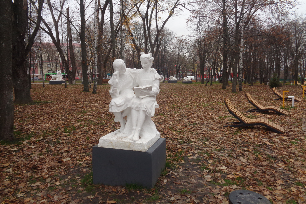 Что ещё порадовало. Восстановили фигуры пионеров при входе, утраченные давным-давно; а главное, вернули старое название парка. За что отдельное спасибо.