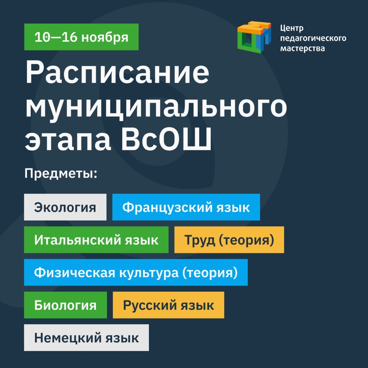 Муниципальный этап в самом разгаре: начинаем насыщенную неделю с дайджеста предметов ➡️ 🗓 Экология 10 ноября 16:00 🗓 Французский язык 11 ноября 16:00 🗓 Итальянский язык 12 ноября 16:00 🗓 Труд (теоретический тур) 12 ноября 16:00 🗓 Физическая культура (теоретический тур) 13 ноября 16:00 🗓 Немецкий язык 14 ноября 16:00 🗓 Русский язык Для 10-11 классов — 15 ноября 10:00 Для 9 классов — 15 ноября 15:00 Для 7-8 классов — 17 ноября 16:00 🗓 Биология Для 9-11 классов — 16 ноября 10:00 Для 7-8 — 16 ноября 15:00 Подробнее на сайте ВсОШ #ДОНМ #олимпиадноедвижение